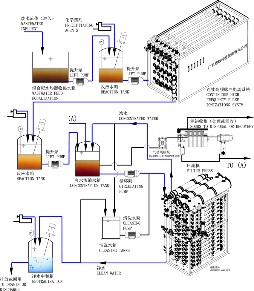 連續(xù)高頻脈沖電離膜處理設(shè)備是當(dāng)今世界最新一代電化學(xué)水處理設(shè)備。連續(xù)高頻脈沖電離膜處理工藝能有效去除水中膠體和懸浮類污染物質(zhì),并對乳化油、大分子有機物、微生物、重金屬離子、氟離子、濁度和部分有色類物質(zhì)具有良好的去除效果,因此能廣泛地應(yīng)用于各類廢水治理和給水處理工程。和傳統(tǒng)化學(xué)混凝相比,連續(xù)高頻脈沖電離膜處理工藝具有分離效果好、泥渣含水率低、占地面積小、易于實現(xiàn)自動控制等優(yōu)點。