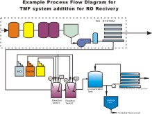 2. RO濃水回收---圖2顯示的是TMF作為二級RO預處理回收含有高濃度硬度、離子、有機物和硅的一級RO濃水的系統。一般情況下,一級RO濃水進如反應池1#,加入化學藥劑促使顆粒物絮凝。接著進入反應池2#,加入藥劑促使硬度和硅沉淀,出水再進入濃水池經TMF處理,濃水被循環回TMF前再次稀釋。固體濃度保持在3-5%,剩余的固體經壓濾機進一步處理或處置。
