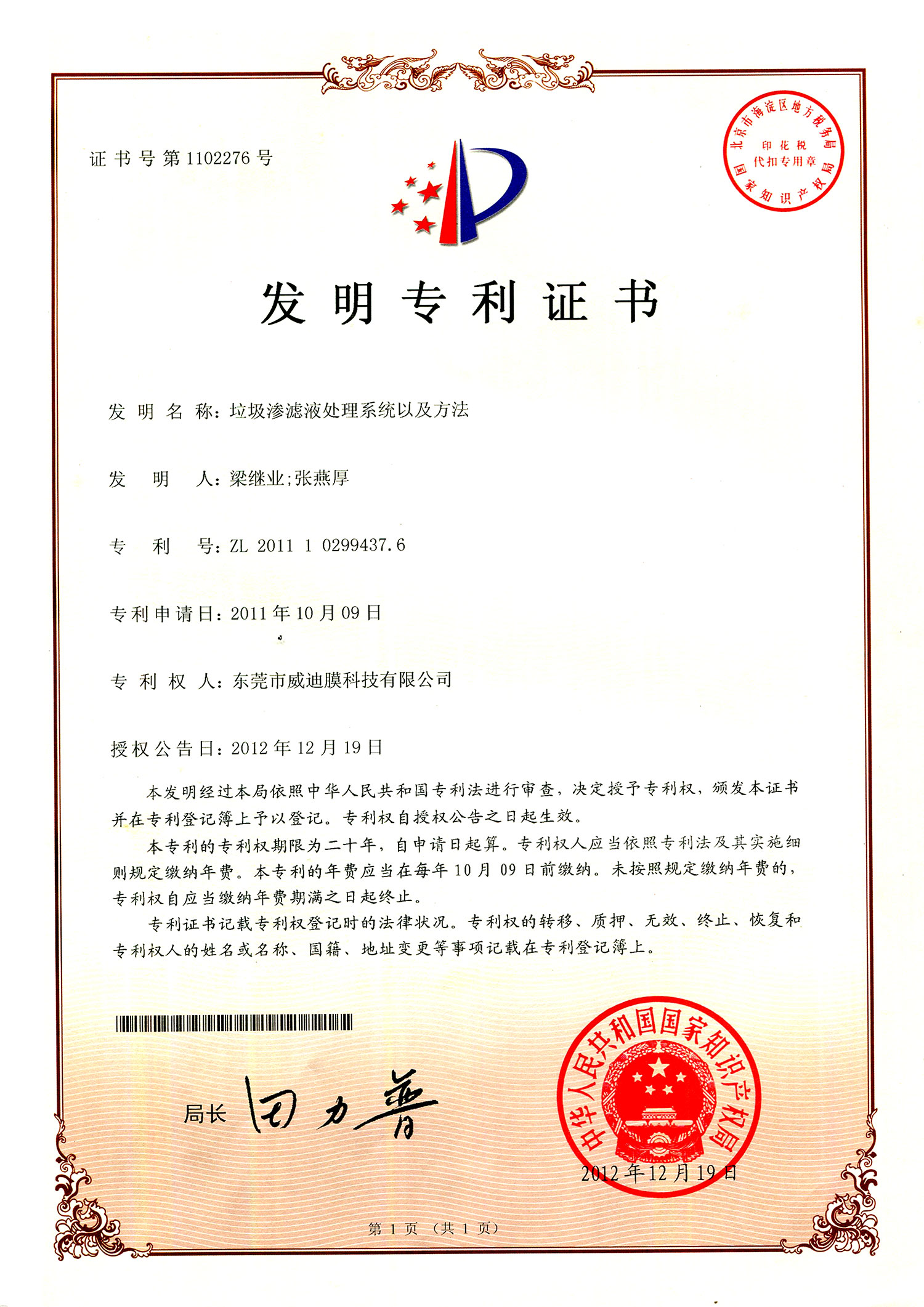 20121219發明專利-垃圾滲濾液處理系統以及方法