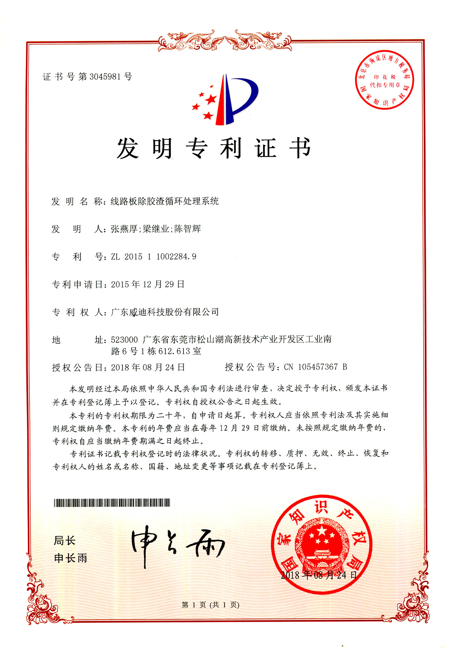 20180824發明專利-線路板除膠渣循環處理系統