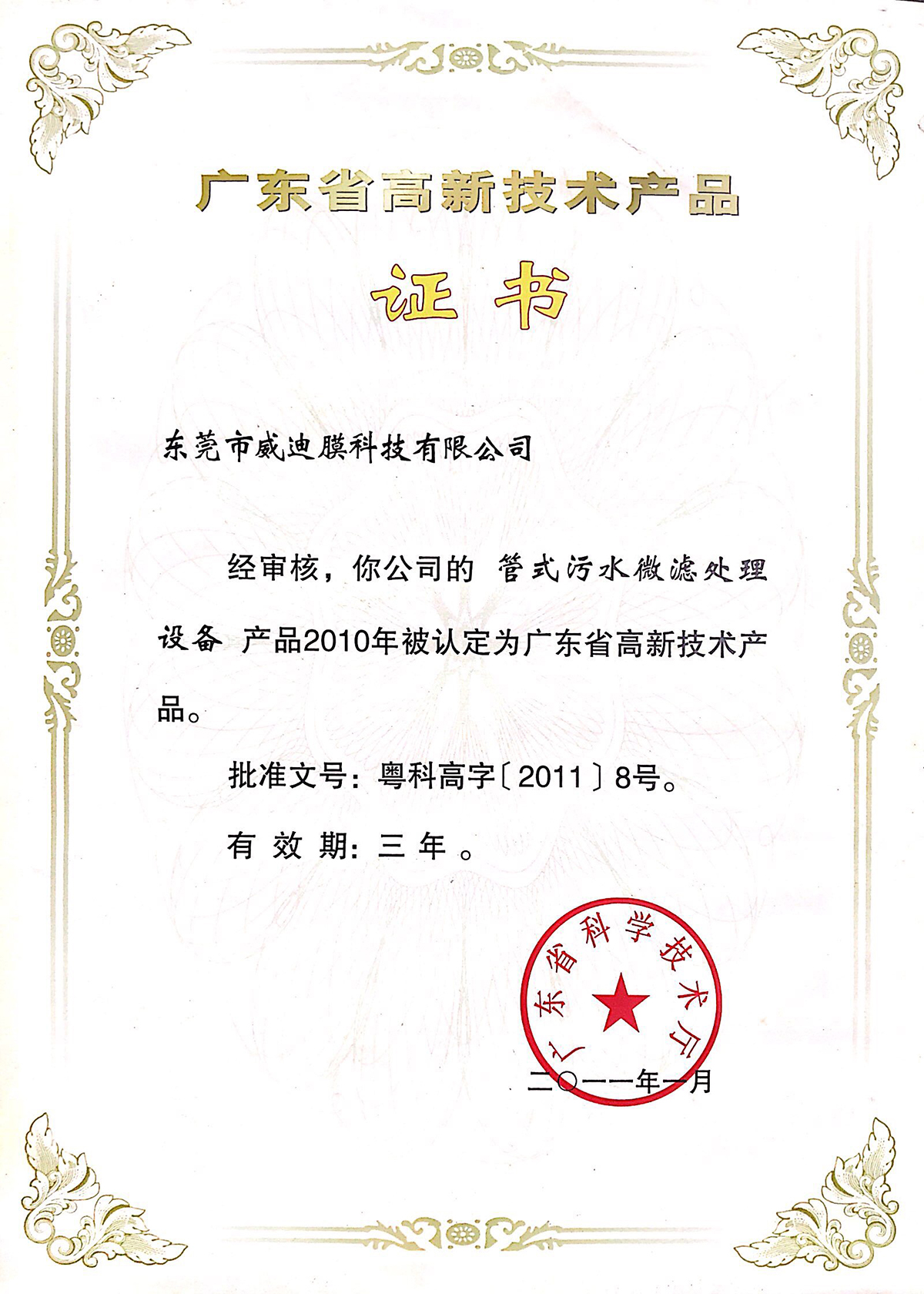 2011年廣東省高新技術(shù)產(chǎn)品-管式污水微濾處理設(shè)備