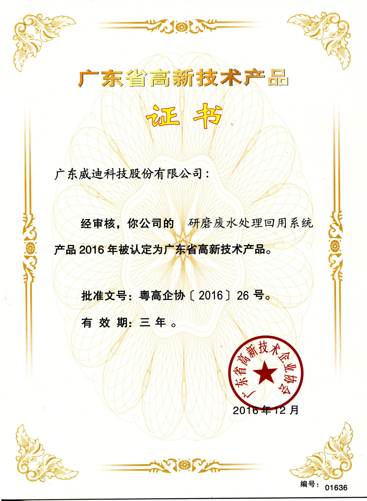 2016年廣東省高新技術產品-研磨廢水處理回用系統(tǒng)