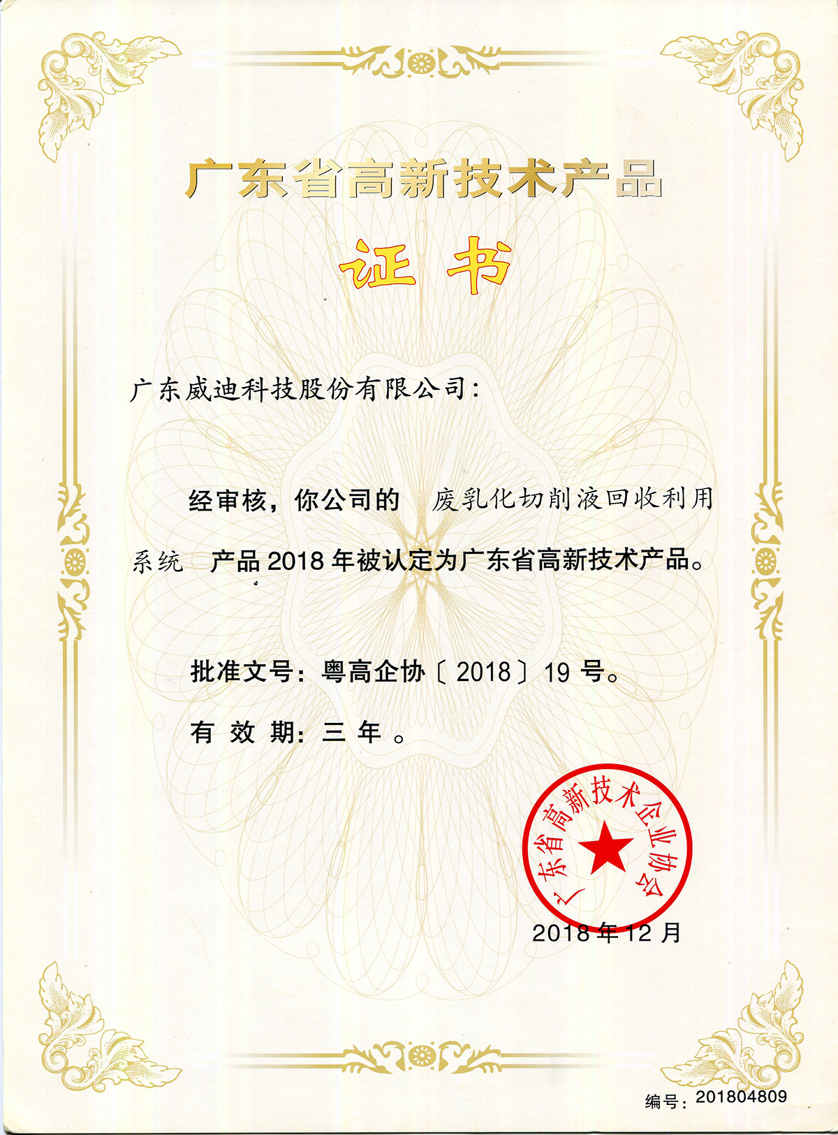 2018年廣東省高新技術(shù)產(chǎn)品-廢乳化切削液回收利用系統(tǒng)
