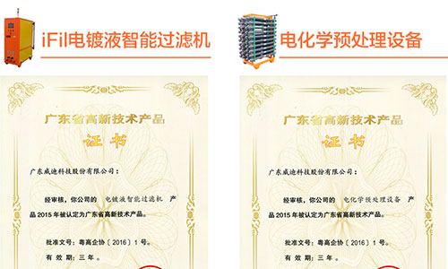 2016年1月,威迪創新產品電鍍液智能過濾機、電化學預處理設備同時獲得了東高新技術產品認定證書。高新技術產品認定條件首先需要的是知識產權歸屬明晰、技術成熟、市場潛力大,有較好的經濟效益、社會效益和環境效益,符合可持續發展的要求,生產過程應符合國家產業政策、安全和環境保護的要求。