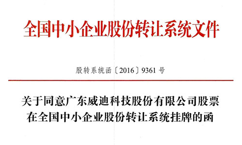 2016年12月19日廣東威迪科技股份有限公司成功通過全國中小企業股份轉讓系統的掛牌申請(股票代碼:870419),邁開了威迪股份正式進入資本市場的第一步。